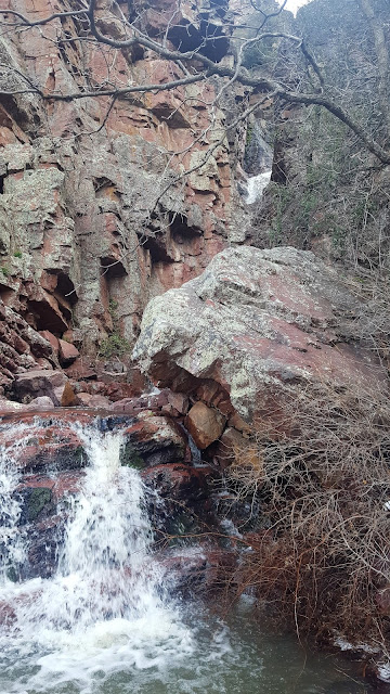 A quarter mile into the hike, HB and I have a decision to make: Cross the river which was raging and wide, or scramble up and over rocks to stay on the same side of the river. We chose the 2nd alternative which was a mistake. That scramble took a lot out of us and turned out to be totally unnecessary because we eventually had to cross the river anyway in order to make any progress. A total of 10 river crossings and 2 miles later, we were drenched, tired and stopped to eat lunch. We reached a point where there was no room to walk on either side of the river due to thick mesquite, so the only alternative would have been to walk in the river for several yards upstream and we decided that wasn't going to happen with the river at that level. The water was up to my thighs and running fast for many of the crossings, and we had to take great care not to step in the many areas of quicksand under and near the water (it almost took my shoe several times). It was a fun adventure for us old guys and we headed home tired and satisfied.
